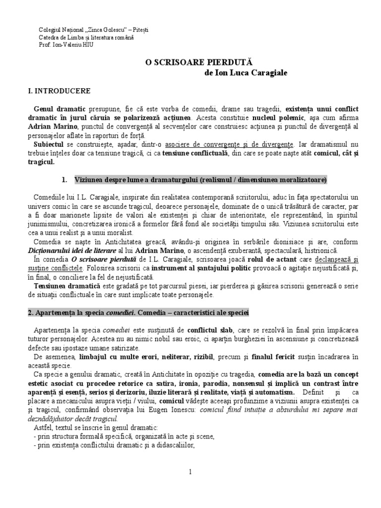 Fisa De Lectura O Scrisoare Pierduta