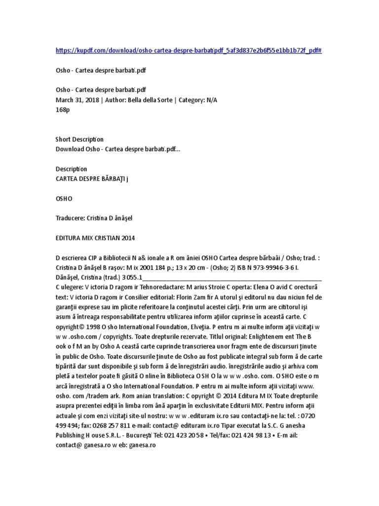 Fragment din carte cartea despre barbati pdf 73 kb serie osho relații cartea despre bărbați. Carousel previous carousel next. Prima si ultima libertate. Responsabilitatea de a fi tu insuti.