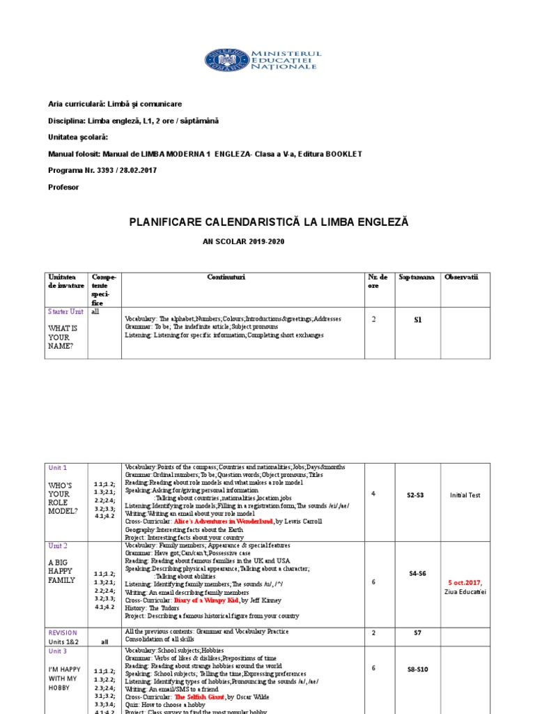 Planificare Clasa A Iiia Limba Moderna Engleza Ed Booklet