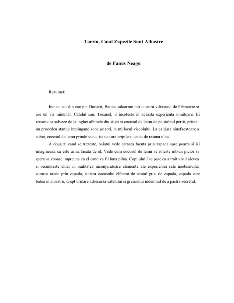 Tarziu cand zapezile sunt albastre fanus neagu referate tarziu cand zapezile sunt albastre fanus neagu titlul acestei opere literare are o pronuntata valoare metaforica zapezile albastre putand fi amintirile copilariei fericite pe care adultul scriitorul le traieste mai tarziu la maturitate. Carusel înapoi carusel înainte. 16185 clase participante 3784 școli din românia 11828 teste publicate 18 distincții câștigate. Câștigă puncte și ajută ți echipa să i învingă pe crocobeți.