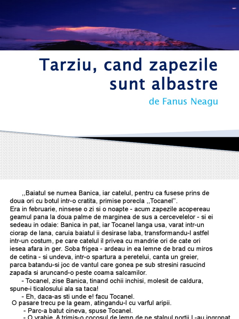 Tarziu cand zapezile sunt albastre. întregul text este de un farmec cuceritor izvorât din puritatea sufletească a copilului capabil să imagineze un univers fascinant fabulos în care totul este posibil. Documente similare cu tarziu cand zapezile sunt albastre de fanus povestirea. Târziu când zăpezile sunt albastre rezolvă testul târziu când zăpezile sunt albastre pe platforma educațională kidibot. Tarziu cand zapezile sunt albastre.