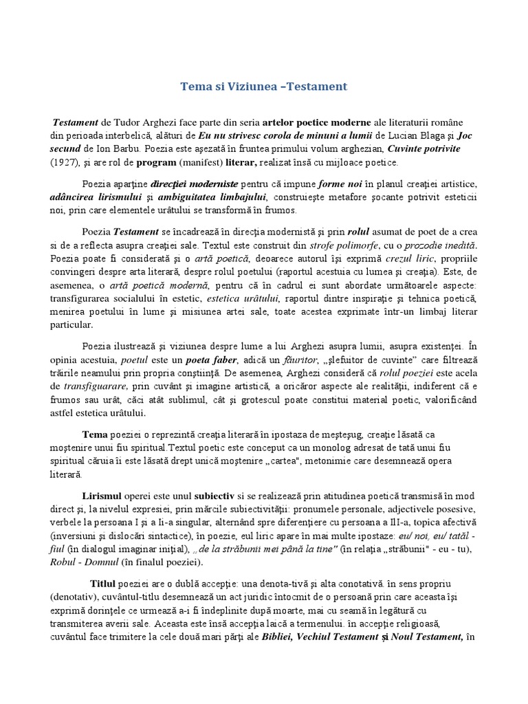 Testament Eseu Despre Tema Si Viziunea Despre Lume